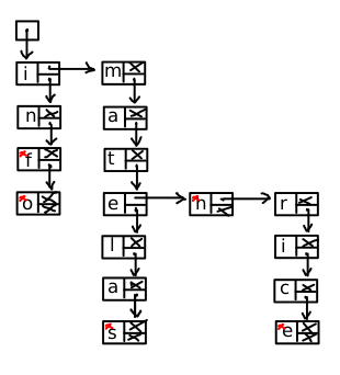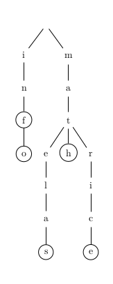 L’ensemble de mots { “inf”, “info”, “matelas”, “math”, “matrice”} est représenté par l’arbre